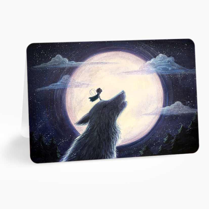 Felicitare cu micuța zână Lia urlând la lună împreună cu lupul.