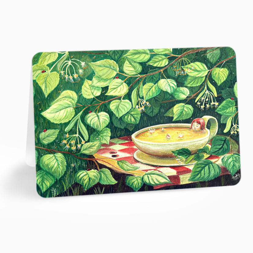 Felicitare cu micuța zână Lia relaxându-se într-o cană cu ceai de tei.