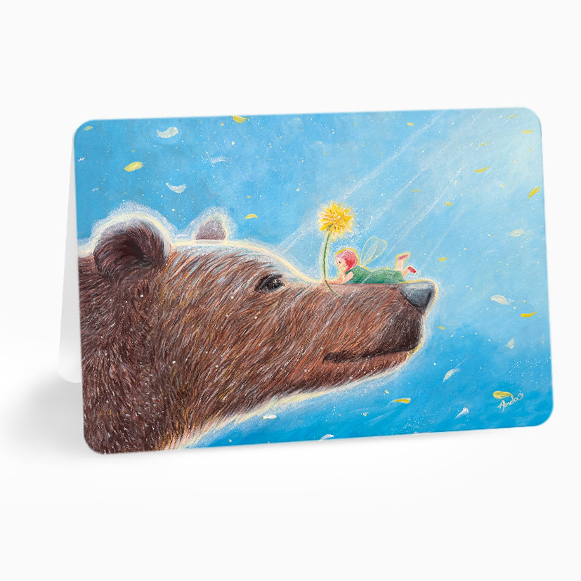 Felicitare cu micuța zână Lia aducând ursului o păpădie în lumina caldă a primăverii.