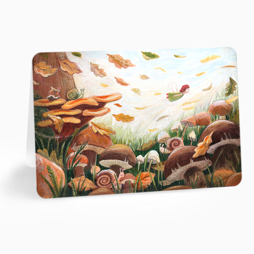 Felicitare cu micuța zână Lia plutind în aer cu frunzele de toamnă.