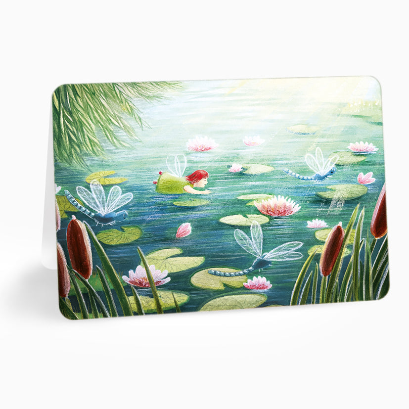 Felicitare cu micuța zână Lia jucând prinselea cu libelulele deasupra lacului cu nuferi.