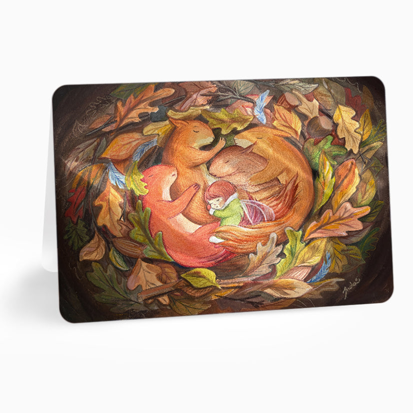 Felicitare cu micuța zână Lia dormind cu veverițele în cuib.