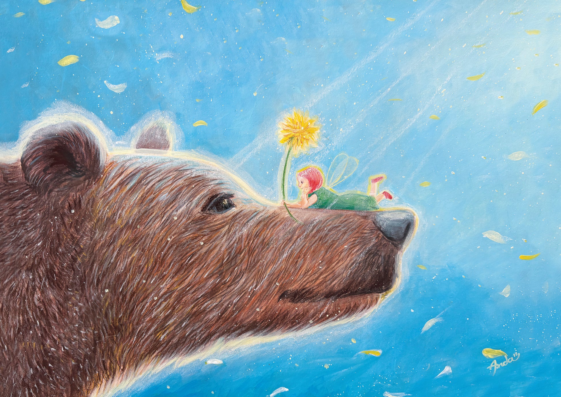Tabloul e pictat cu acrilice, creioane colorate, pasteluri, pe carton de bumbac 100%, înrămată cu ramă de lemn natur.
